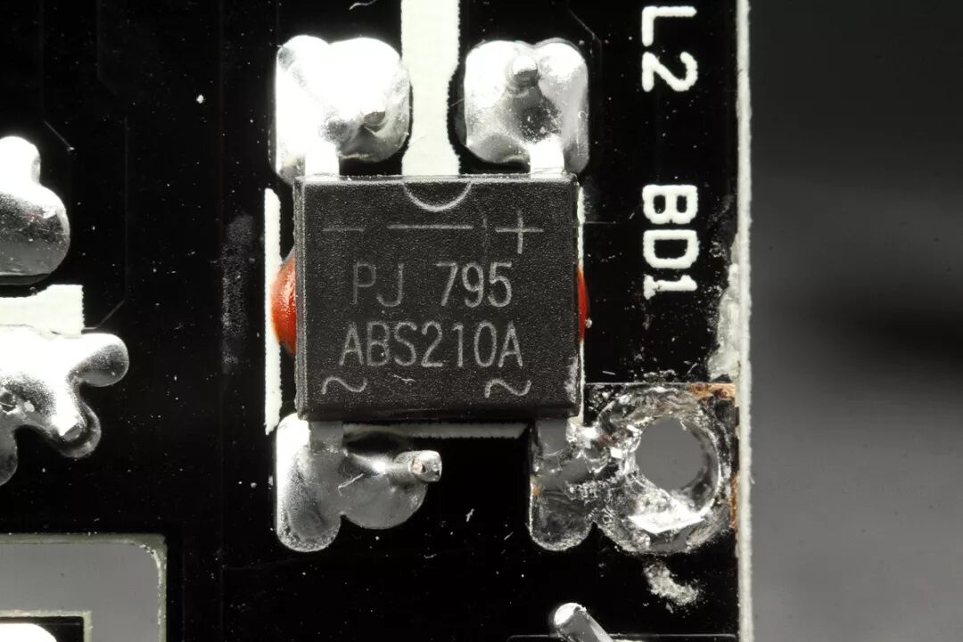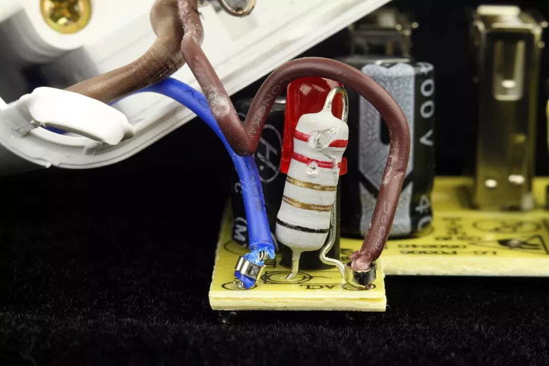 棕色软线为交流电源L火线输入,使用了压接焊脚透孔安装。另一条蓝色交流电源N零线输入线已在拆解时先行焊下。