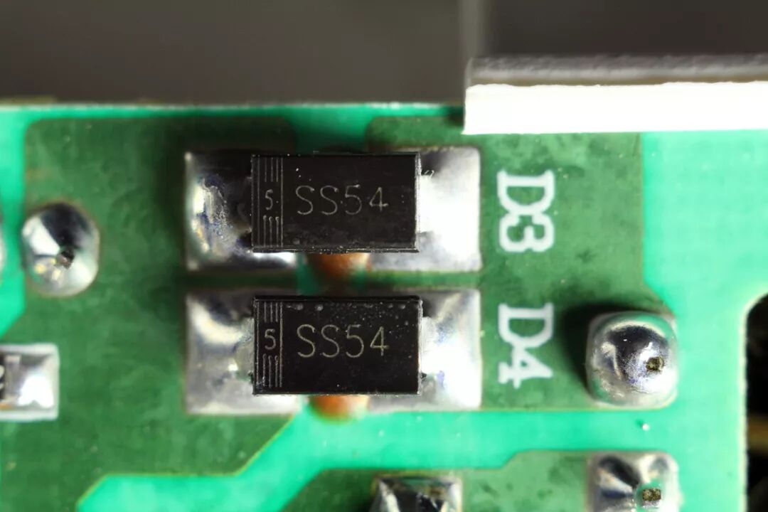 SS54贴片肖特基二极管,40V 5A,2只并联。考虑到此USB模块的实际功率仅为7.7W,散热压力不大。