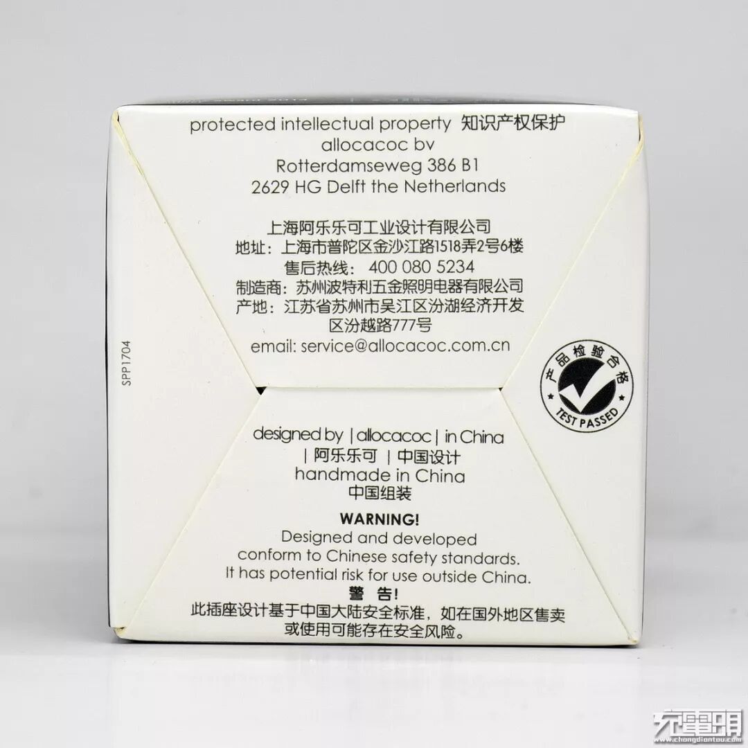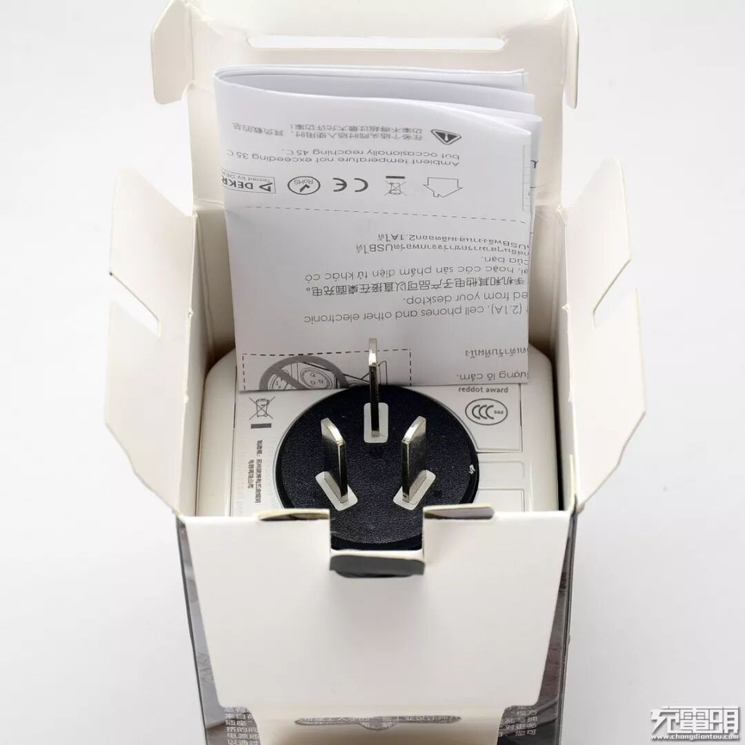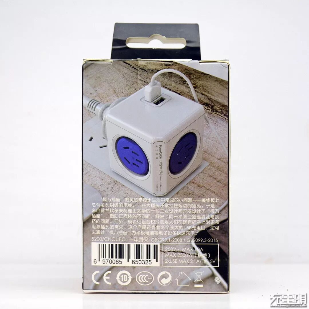 阿乐乐可powercube使用了三色设计,主体为奶白色亮面,四面五孔AC输出插孔芯为鲜亮的磨砂蓝色,而AC输入插脚芯为粗磨砂黑色。顶面有2个USB-A充电输出母座,支持5V/2.1A输出。阿乐乐可线条繁复,印字内容较多,产品标注有CE及CCC认证,并且还有德国红点设计奖标志。