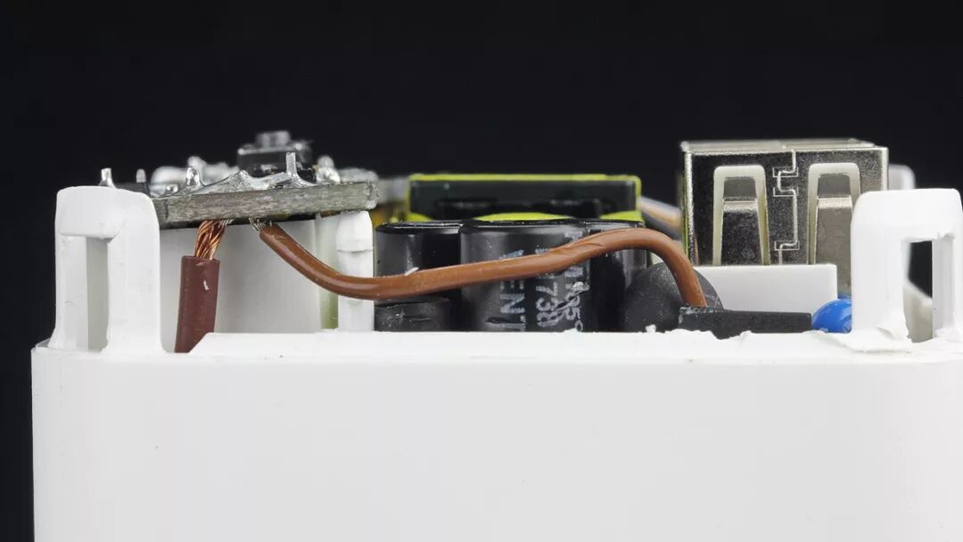 USB模块下使用了一块黑色绝缘板。对交流插脚与PCB版之间进行加强绝缘。