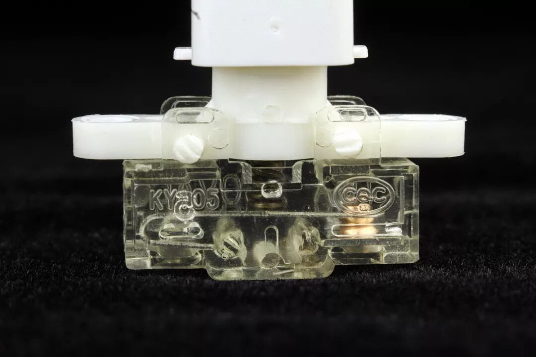 前盖上的轻触按键按钮注塑模具精细,自带弹力。按钮左右各有一个较短的锁孔用于与开关模块固定柱压紧,另外3个稍长的支撑脚用于与USB模块压紧。