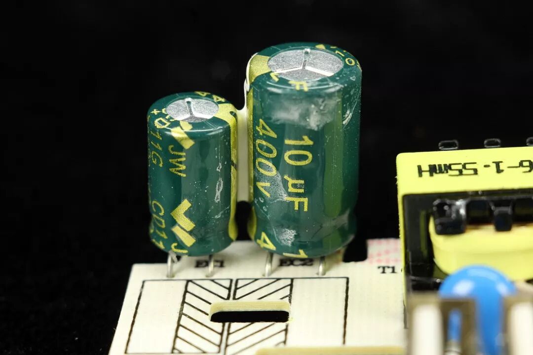 初级400V滤波电容,6.8+10μF,黑色热缩管包裹的是保险。