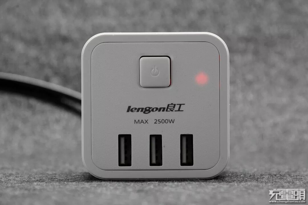 4.良工 XD-Q604U3产品正面照,外观体积上与其他魔方插座有较高的相似度。正上方一枚机械按键,总控电源开关,右侧是一颗红色LED电源指示灯。下方并排3只USB充电插座,中间是Longon良工中英文logo及小字体的MAX 2500W的提示。纯平面板,四周有一条框线,这是与其他魔方插座最大区别所在。
