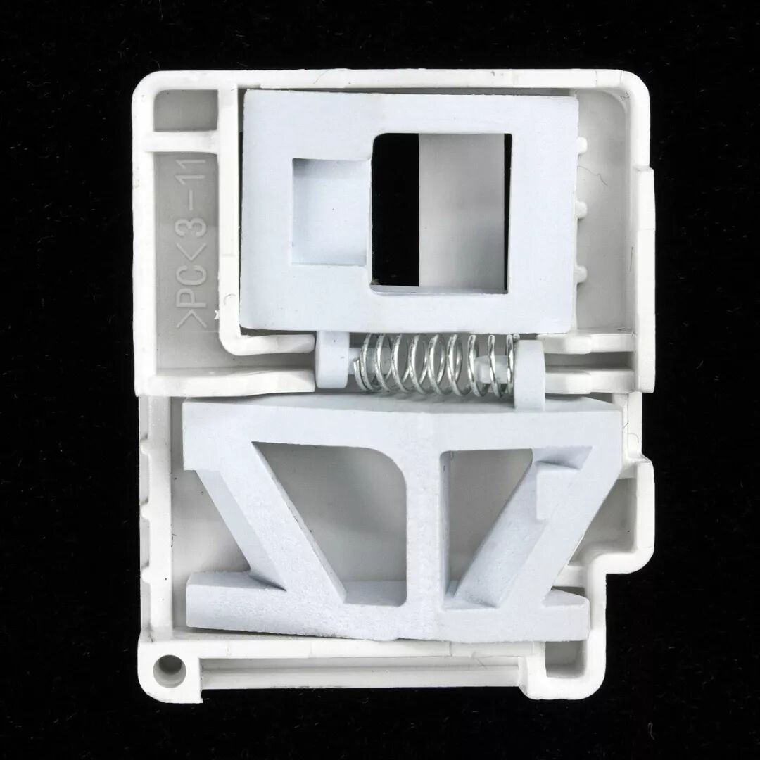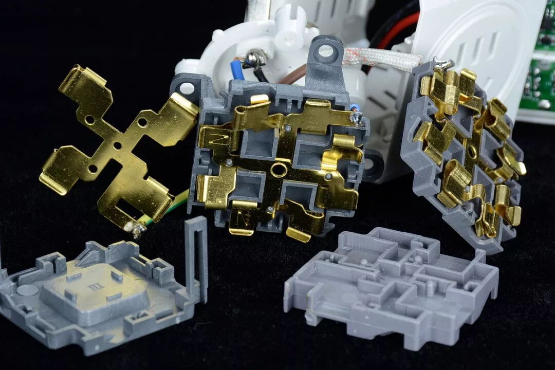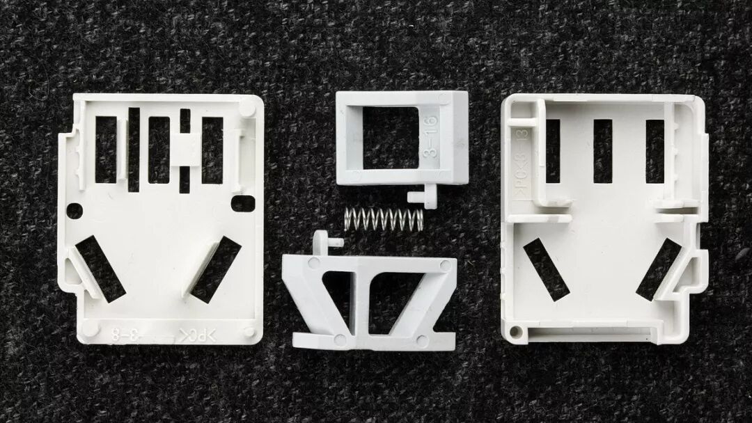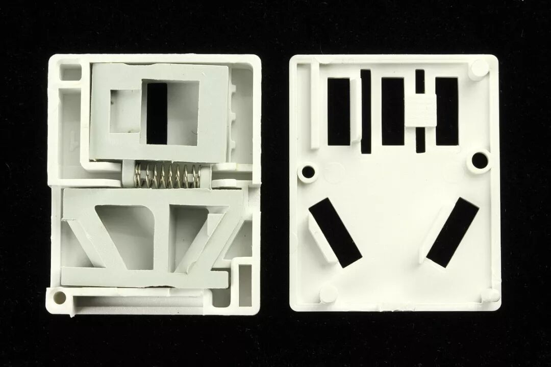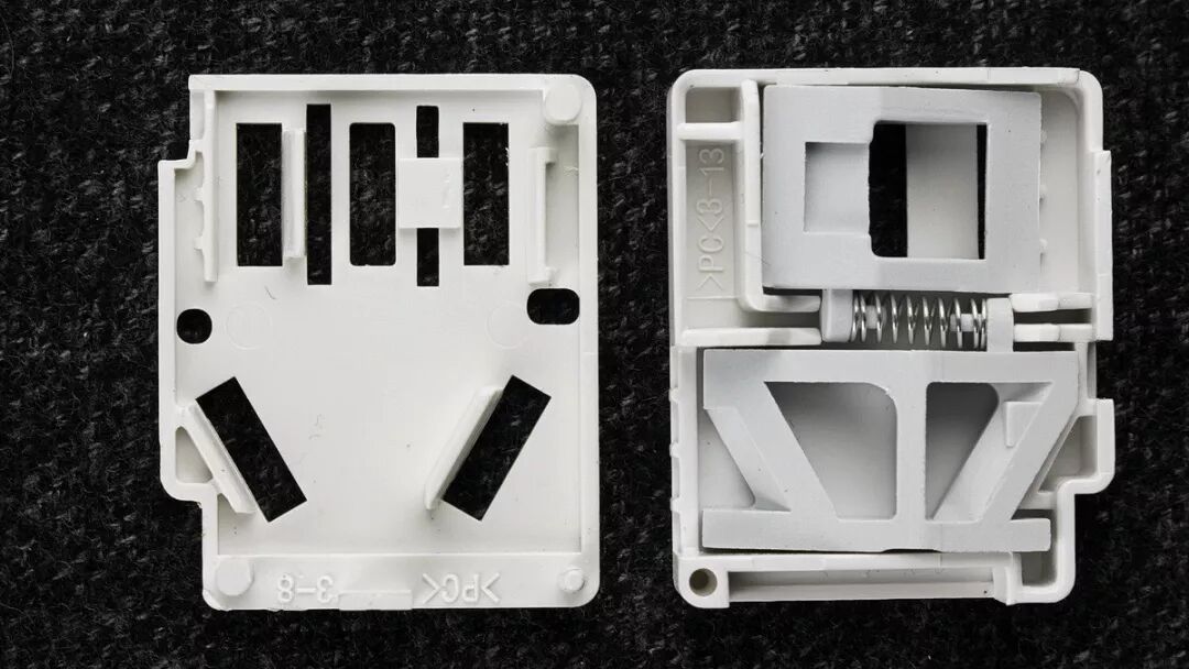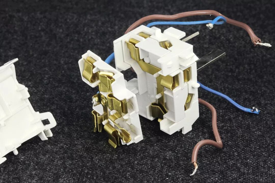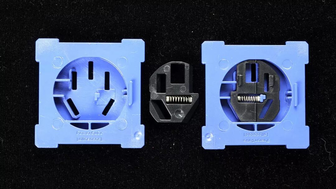 插座安全门模组,盖子是卡扣式的,撬开后可见安全门挡板、弹簧。