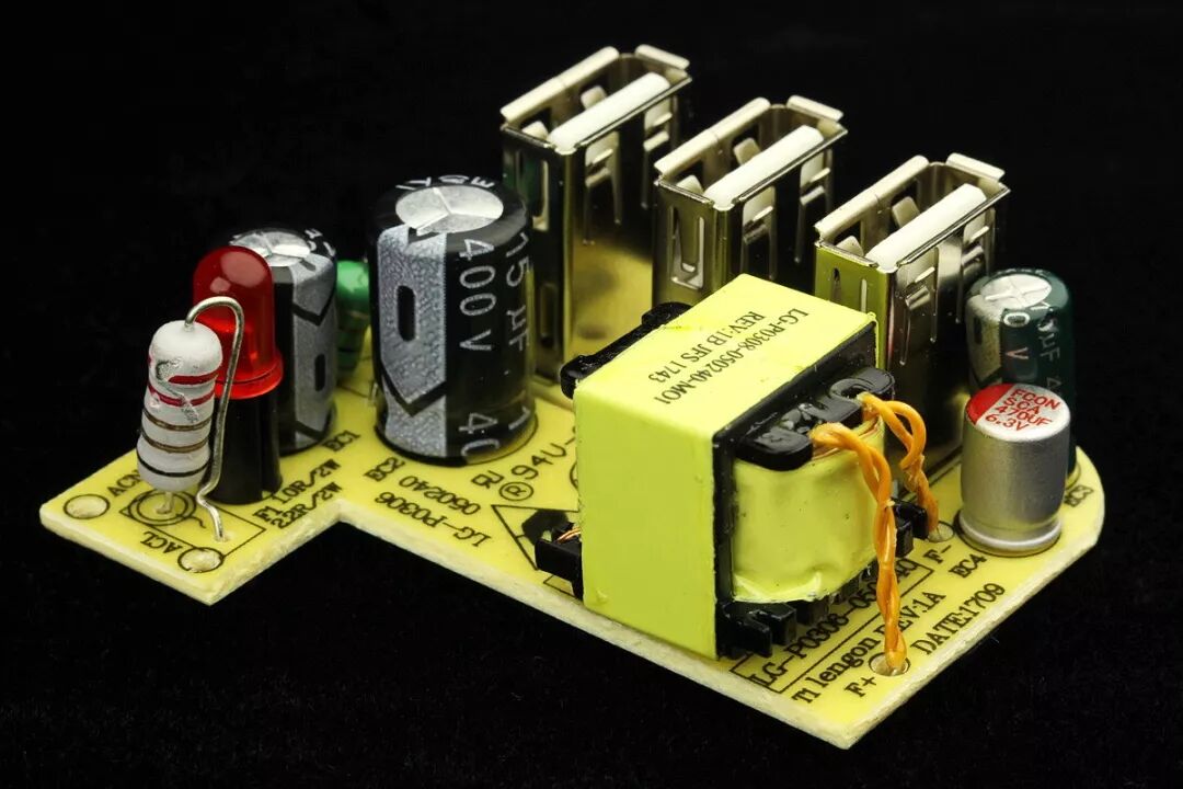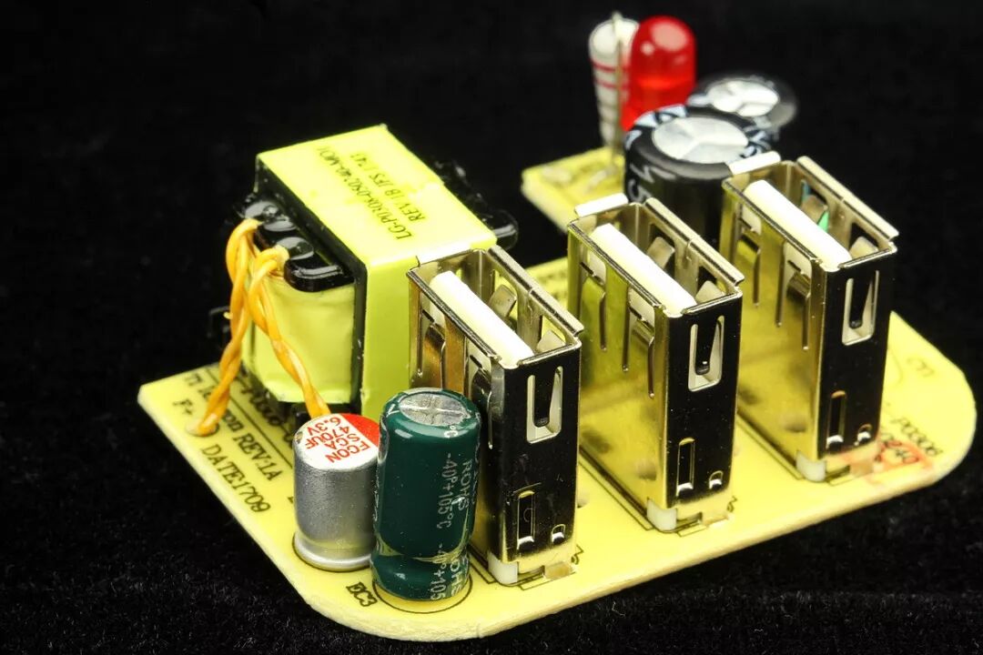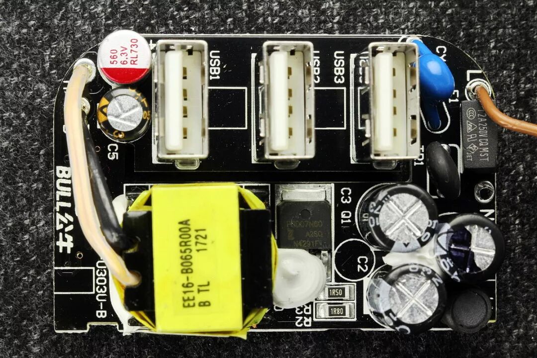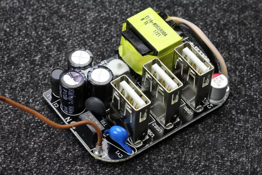 该电路有2组电压输出,一级电压24V使用了2W的稳压管,回路串有限流电阻和一级电感,可以有效降低电网中的谐波干扰和浪涌冲击电流。之所以选择高达24V的一级电压电压,是为了降低在电网电压大幅波动时对电源输出功率的影响,实测表明该电路在110V~低电压条件下使用也是较为可靠的。专用X电容的使用以及3只贴片电阻串联而成的泄放电阻,提高了耐压等级,更安全。USB模块顶视图,同样的黑色PCB。3只USB母座均为铜质,无吸磁反应。
