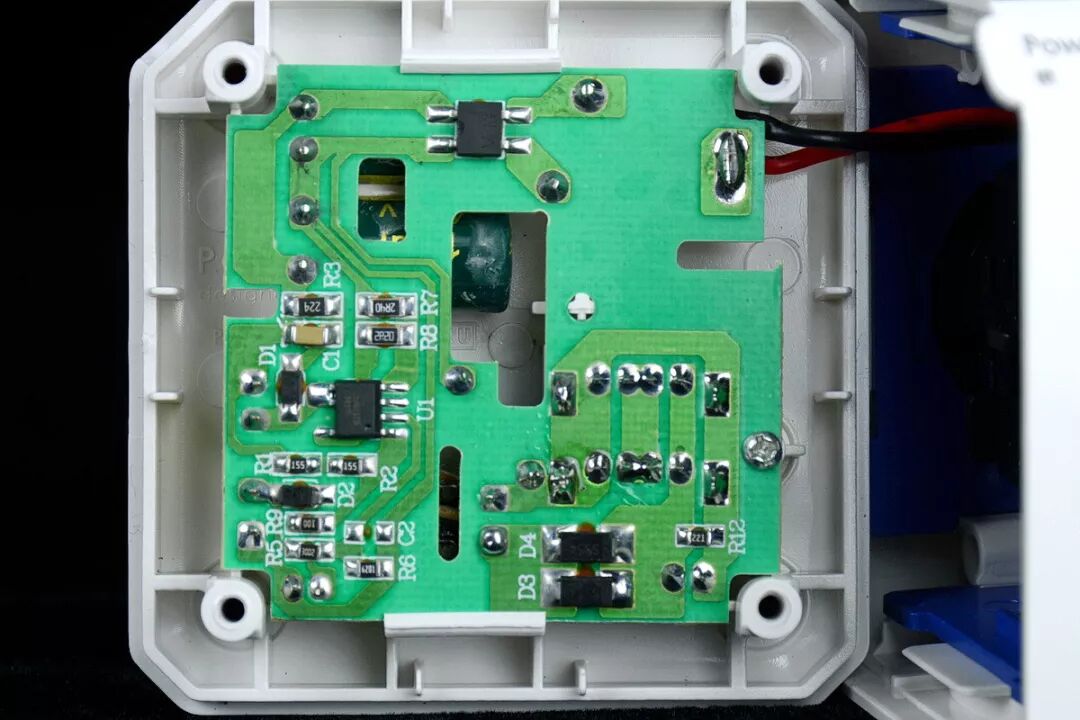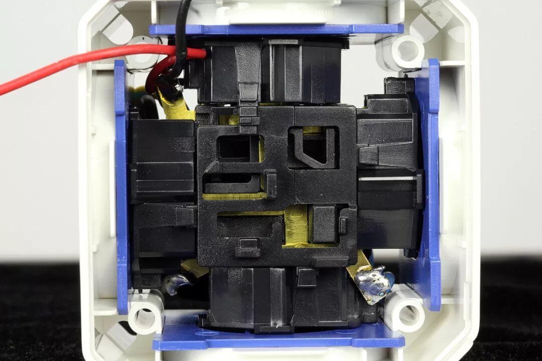 上为USB模块,下为电子开关模块。两只模块的安装高度不同。均未使用螺丝,而是凭借壳体上的高低压隔离带及塑料柱结合前盖固定,可以减轻重量、简化组装工艺,以及防止螺丝意外脱落造成的安全隐患。