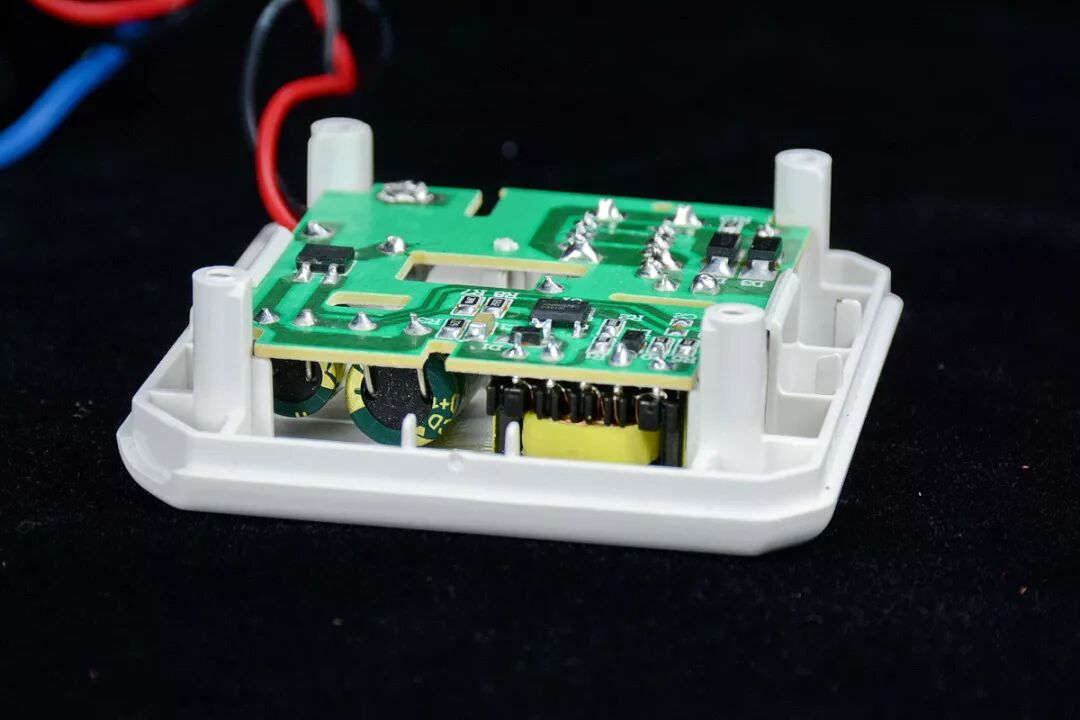 USB模块使用2只螺丝固定在面板上。PCB有高低压隔离槽。USB使用了苹果2.4A电阻识别方案。