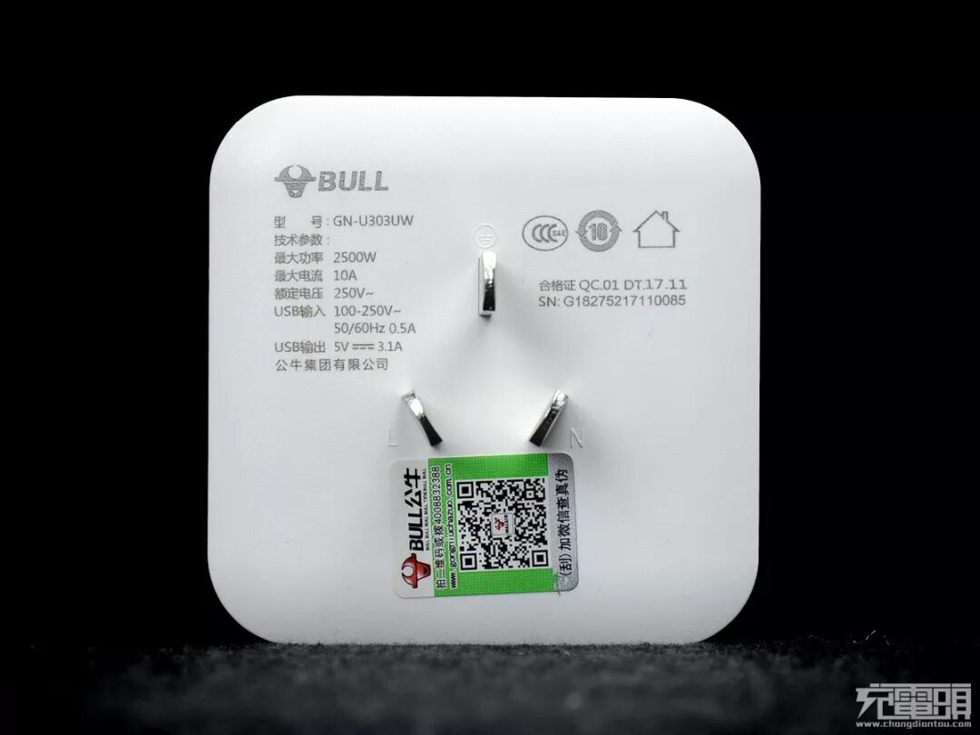 输入端采用国标3脚插头,具备接地功能,插脚纯铜电镀,厚度足,插在墙壁上的五孔插座时会更加牢靠。产品通过了CCC强制性安全认证,安全无忧。防伪标贴,可微信扫码或拨打400电话验证产品真伪。