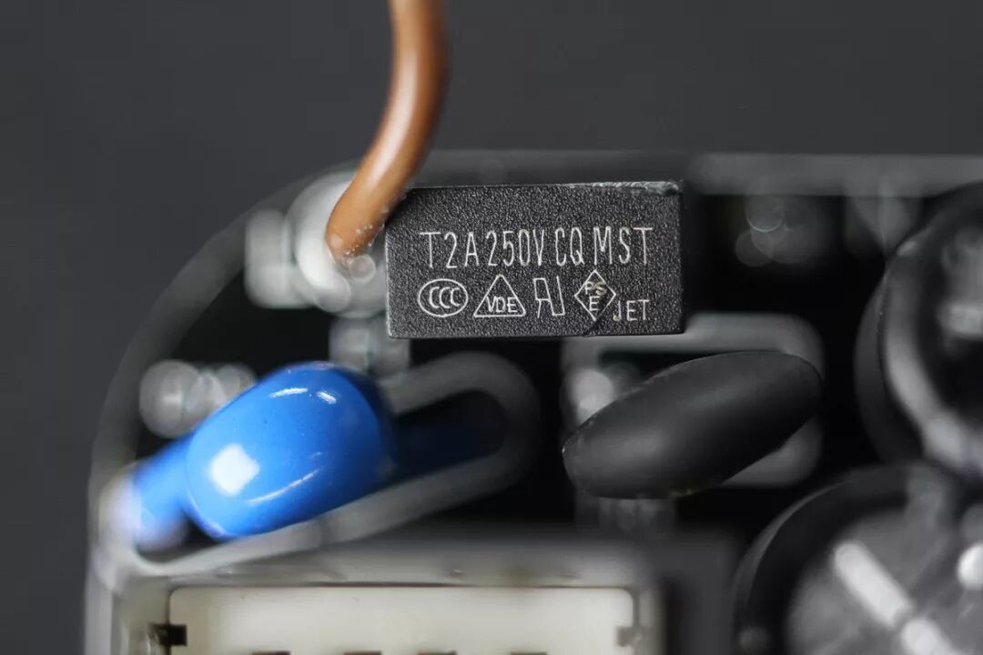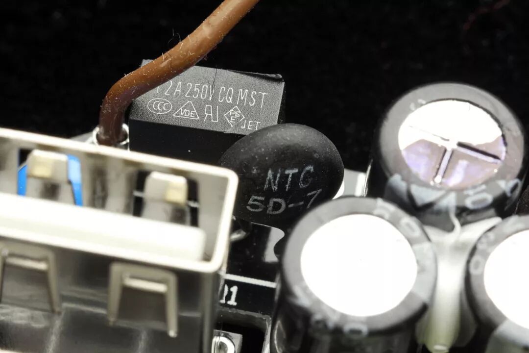 USB模块输入端黑色方块保险来自于台湾功德,规格为T3.15A 250V CQ MST,属于慢熔/延时保险丝,可以避免普通保险丝在开机瞬间被浪涌电流烧毁,高端电源必备。