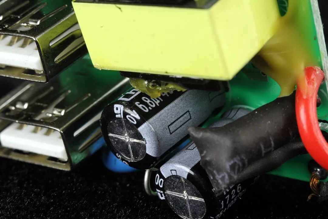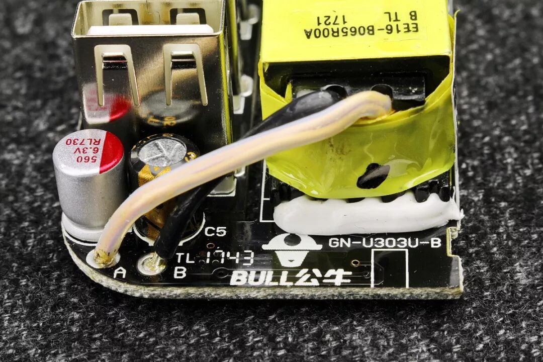 瓶颈来就自于这只变压器,这是因为元件安装高度的限制,变压器的高度与短型USB母座相同,变压器次级绕组使用了较细的多层绝缘线,载流能力不足造成的!留给变压器绕组的空间实在有限,使之成为了木桶中的短板,制约了电路的输出功率。变压器左侧的一只4.7μF、50V一次侧PWM启动电容。