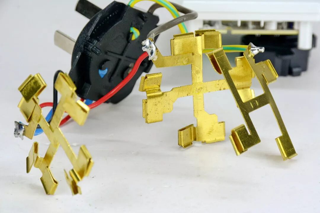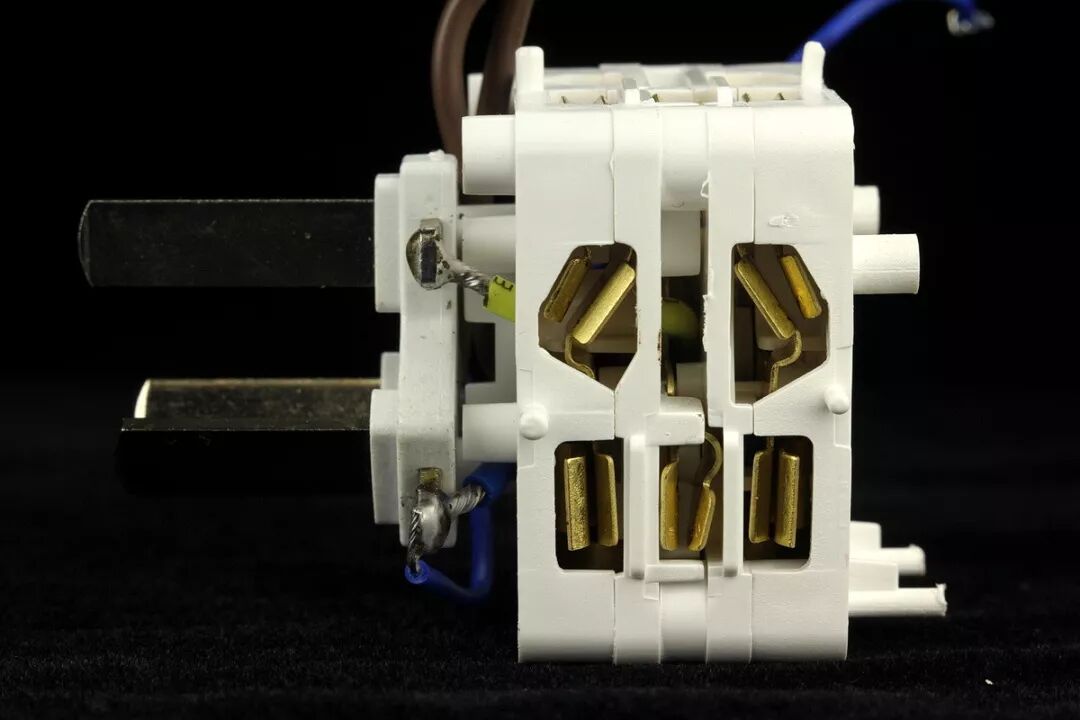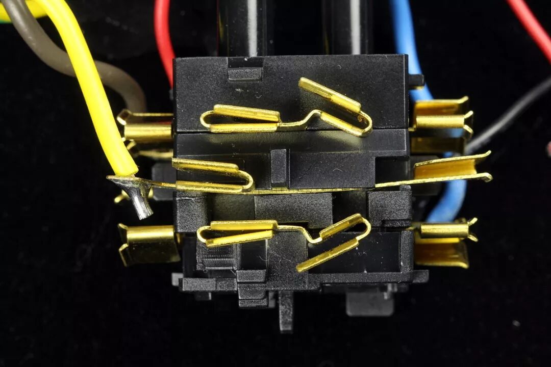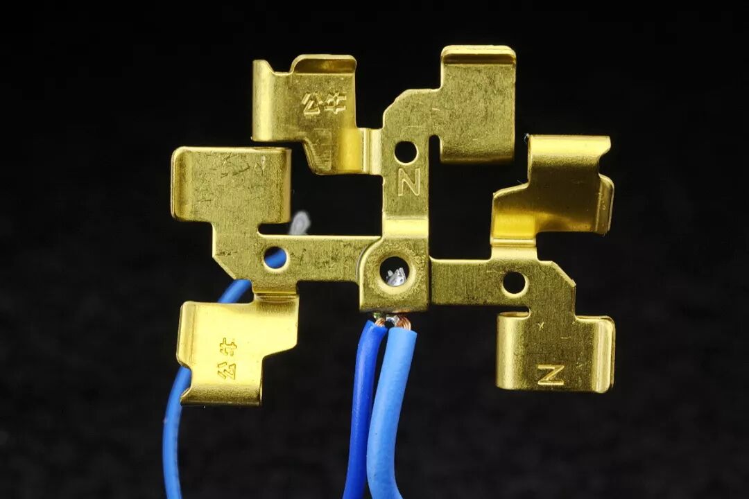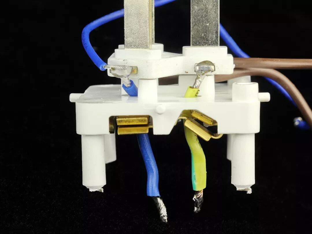 下面分布着3层锡磷青铜插脚模组,像多层面包片或三明治一样层叠在一起。最外层是N极零线模组,使用粗蓝线与输入插头N极插脚直接焊接连通。