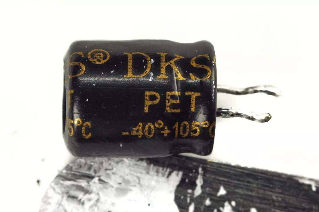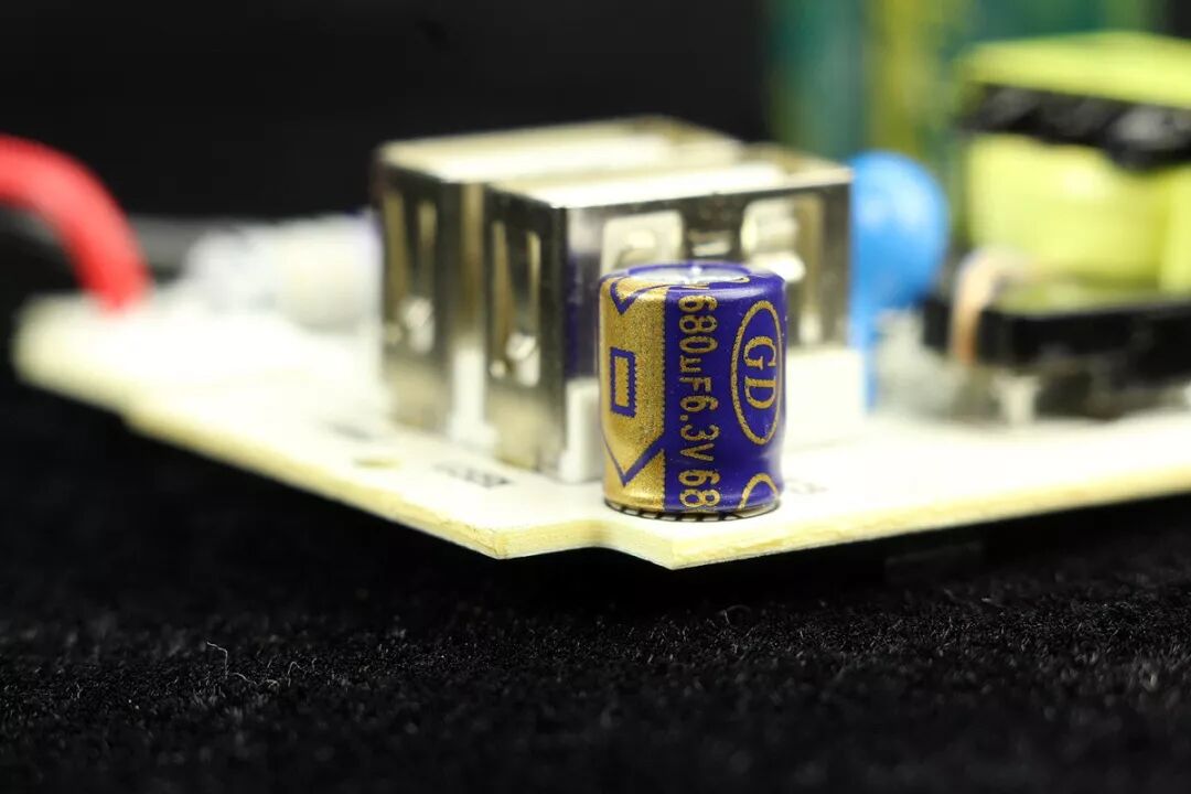 低压侧一只输出滤波小体积铝电解电容,品牌为GD(深圳华凯),规格是680μF、6.3V。