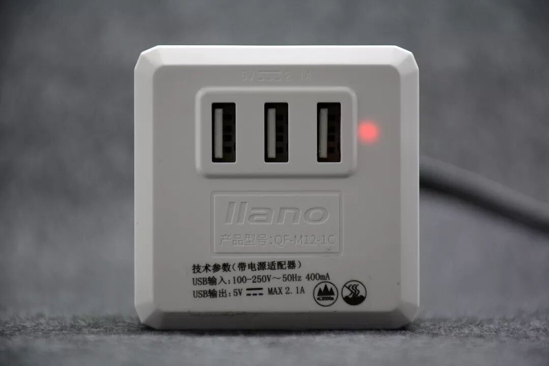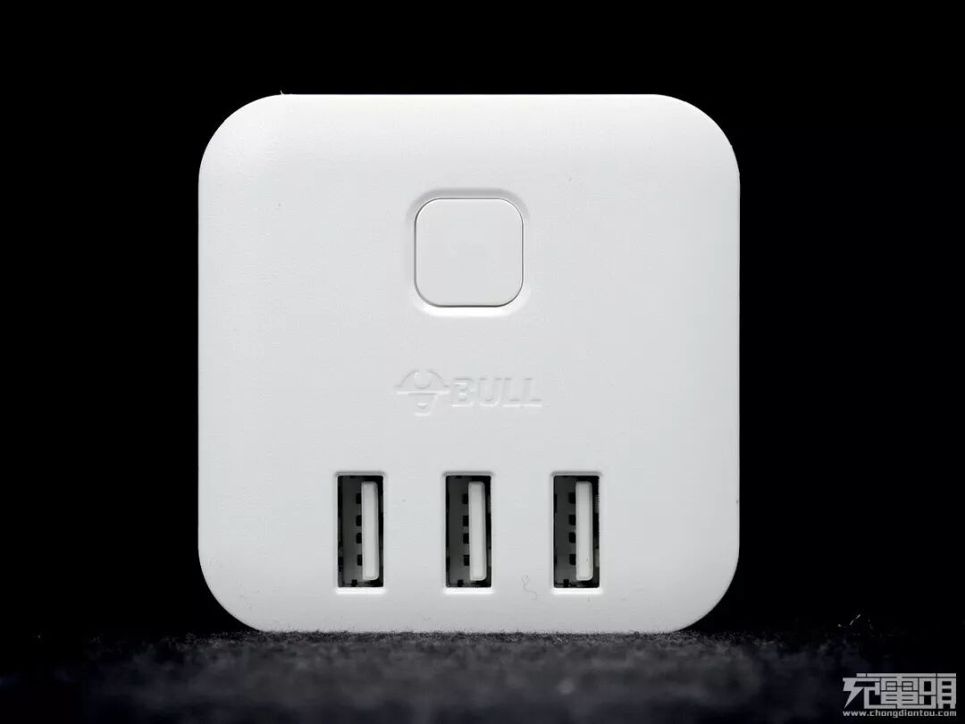 正面有一个轻触按键电子开关,带指示灯。下部是3个USB输出插座。