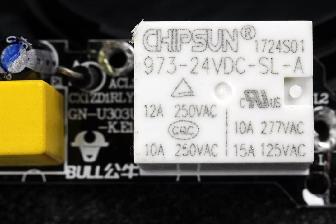 公牛魔方插座使用的MKP-X2 阻容降压专用交流安规电容器隶属X2认证优化系列,采用高分子聚丙烯薄膜介质、加厚型金属化电极、 全自动喷焊工艺,94V0级阻燃PBT塑壳、耐湿热环氧树脂密封、 CP线引出。高耐压、耐湿热、低容降,专用于阻容降压电路,可见其对产品安全性能的重视与严谨的态度,远非山寨货可比拟的。再来看看右侧这只少见的白色外壳的继电器,品牌为CHIPSUN (芯阳),产品型号973-24VDC-SL-A,来自于厦门芯阳科技股份有限公司。