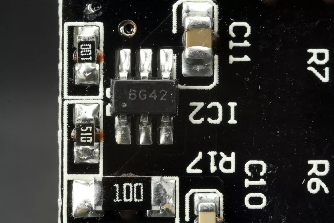 由于电路结构的相似性,同样也适用于本款公牛魔方插座。这面除了安规电容和继电器外,还有几只较大的分立元件,分别是DO-41的2W稳压二极管2EZ24D5(24V);35V、100μF滤波电容;4.7mH滤波电感;1W、47Ω限流电阻各一只,其余的均为贴片元件,分布在PCB的另一面。