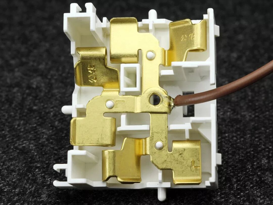 下层L极火线模组,铜带上同样打有记性标记及公牛商标钢印不吸磁。棕线去往电子开关模块的L极输出点。