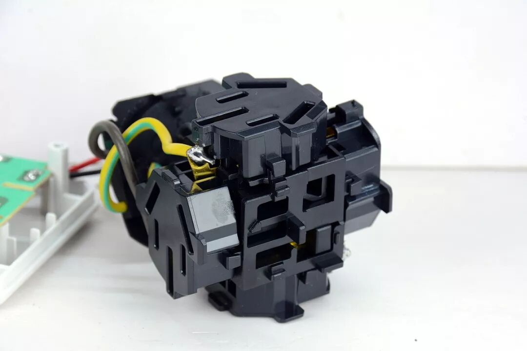 电子开关模块,使用两个塑料扣卡紧,并结合前盖对应位置的孔柱压紧。