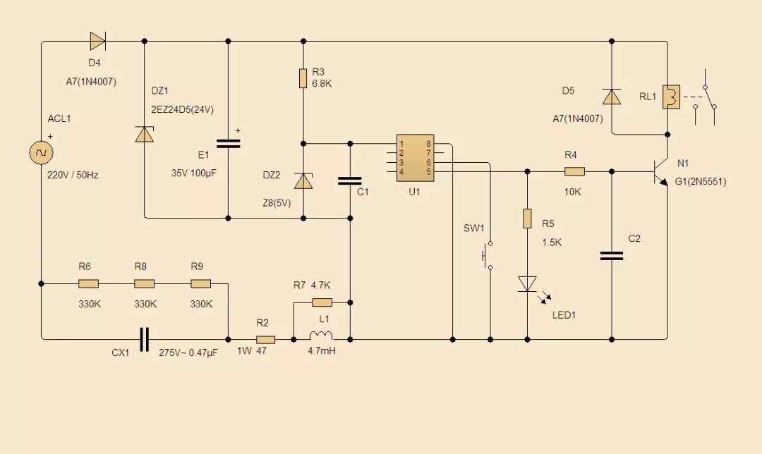 整理了一下开关模块的电路图给大家参考。虽然是一个比较简单的阻容降压电路,但设计还是很严谨的。一般来说阻容降压电路功率较小,无功损耗使得其功率因数较低,但胜在线路简单,成本低廉,所以仍有很多小电器乐于采用。