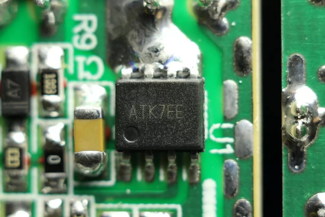 高压侧PWM芯片,sop8封装,丝印代号ATK7EE,实为矽力杰半导体技术(杭州)有限公司出品的SY50133FAC,内置MOS 5V3A 原边反馈。