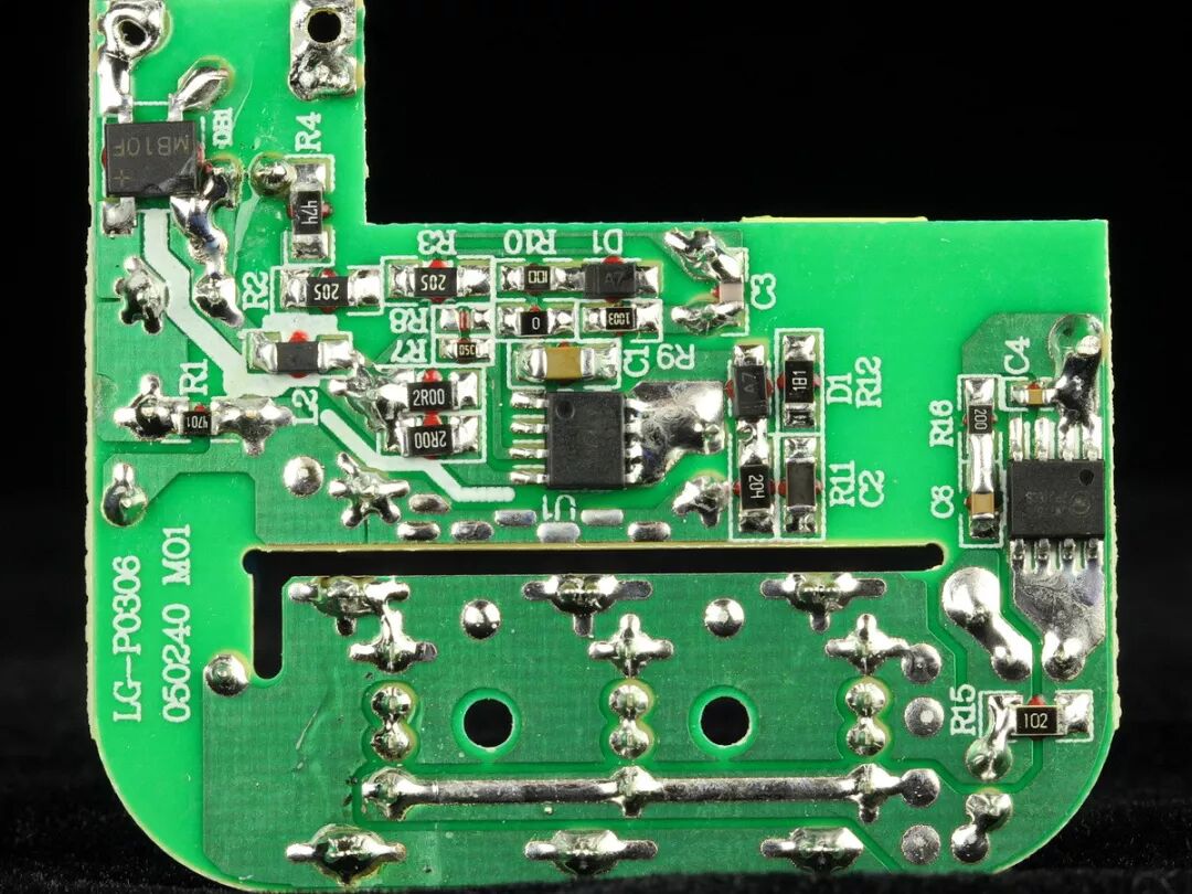 USB模块绿色单面PCB铜箔面,开有高低压隔离槽。下端棕色引线来自输入插头L极火线端子。上端棕色引线为通过开关后输出给USB模块和AC输出插座。蓝色引线来自输入插头N极零线端子,用于给USB模块提供电源回路。