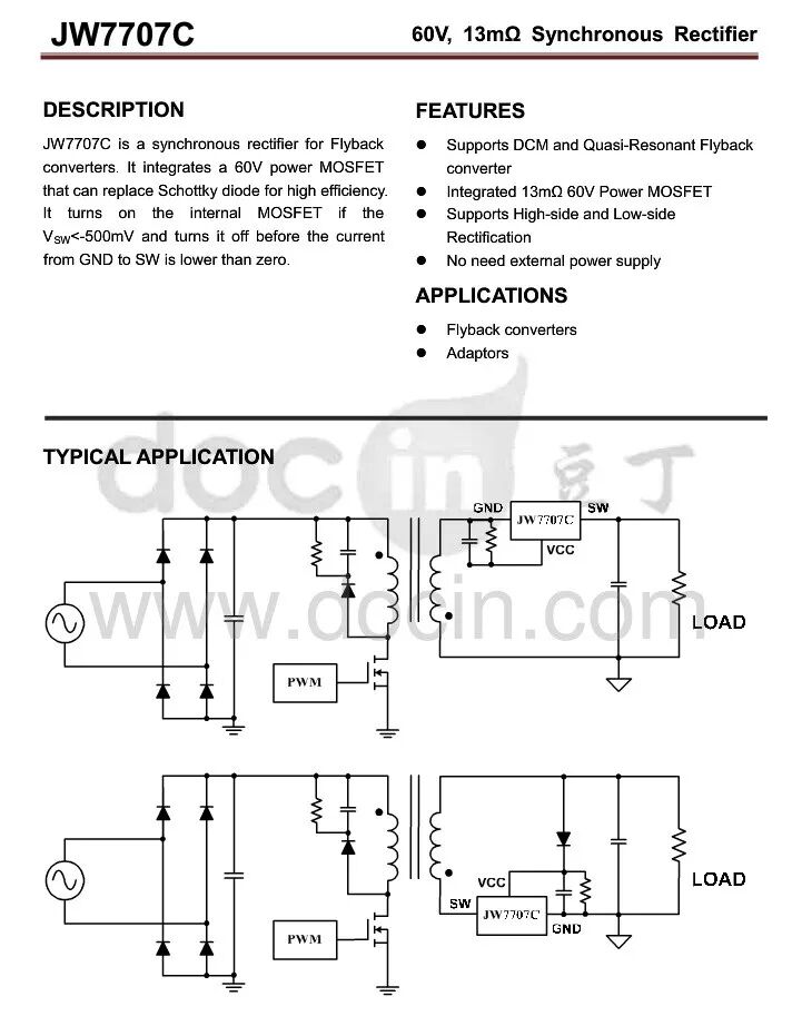 二次侧同步整流IC,JW7707C,来自杰华特微电子(杭州)有限公司。