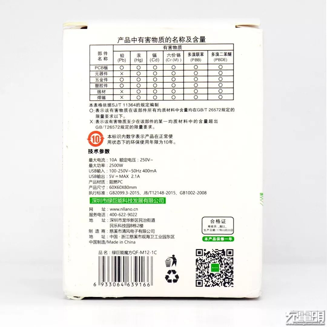 3.绿巨能QF-M12-1C包装盒上的产品信息。代工厂为慈溪市清风电子有限公司。