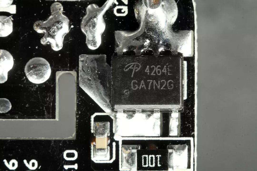 USB输出部分没有使用智能识别芯片,而是将D+、D-短接,所以对苹果设备只能获得1A的充电电流。