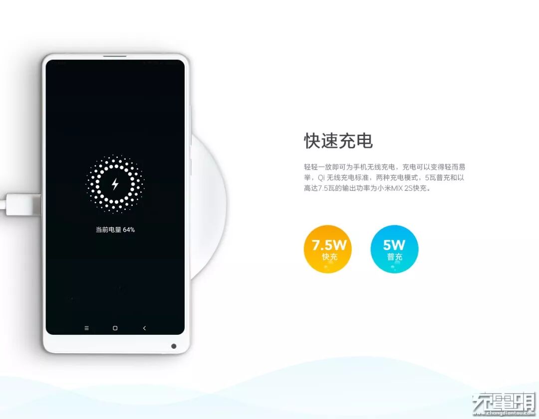 小米发布会则发布了首款骁龙845国产手机小米MIX 2S,它搭载的是7.5W无线充电。与手机一同发布的还有小米无线充电器,随尊享版手机附赠,单独售价99元,搭载Qi标准,不仅支持小米MIX 2S,还支持iPhone 8/X无线快充。发布会上,雷军特地花大篇幅介绍了小米MIX 2S无线充电功能,表示使用小米无线充电器充满仅需2小时40分钟。