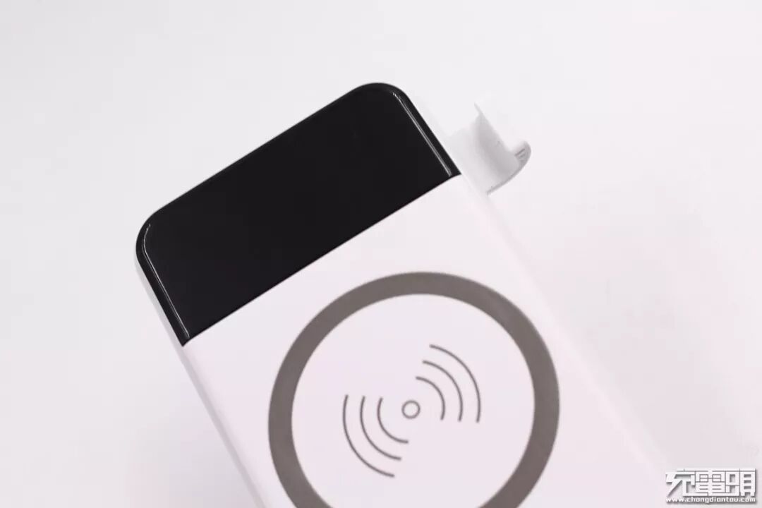 网易严选无线充电移动电源外型小巧、轻薄便携。整体采用阻燃PC材质外壳,防滑耐刮;正面居中位置有一个无线发射的圆形图标,该范围即为无线充电区域。