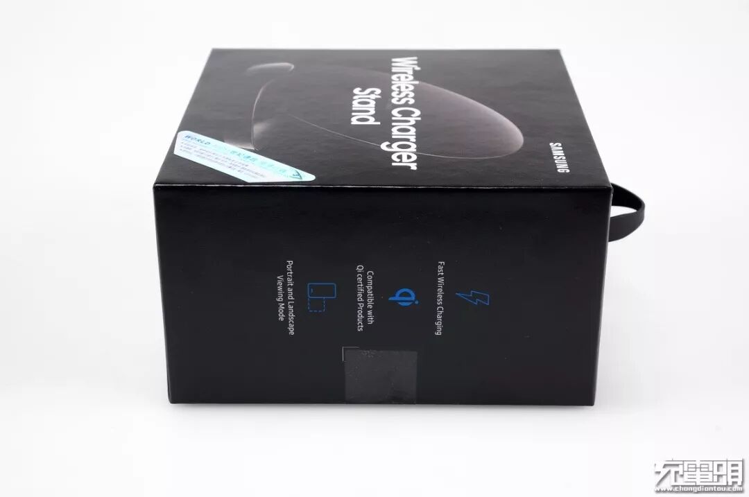 方形纸盒的包装,相比上代要更隆重一些。纯黑的背景,正面标有产品名称:Wireless Charger Stand。