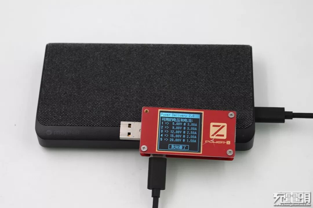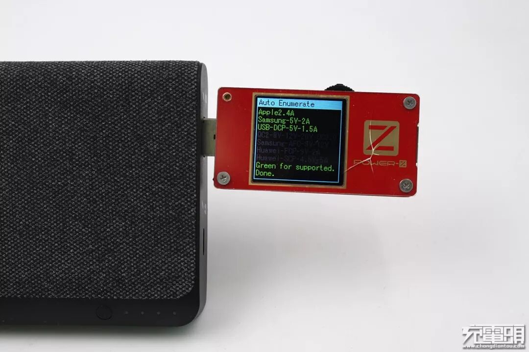 使用ChargerLAB POWER-Z KT001测试,USB-C口输出支持USB PD2.0快充协议。一共有5个电压输出档位,分别是5V/3A、9V/3A、12V/2A、15V/2A。20V/1.5A,最大输出功率为30W,可以为直接给New MacBook充电,速度媲美苹果原装充电器。