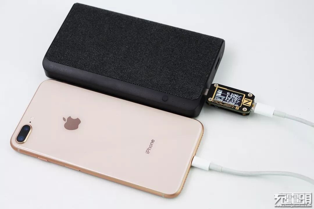 使用ChargerLAB POWER-Z KM001C测试,移动电源USB-C口支持iPhone 8 Plus快充(47%电量),充电电压9.1V,电流1.37A,功率约12.55W。