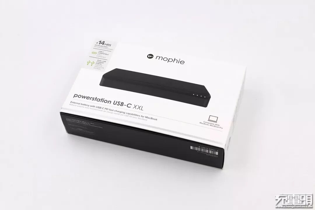 mophie这款移动电源采用抽屉式包装盒,最外一层是白色卡纸套。正面印着产品的外观图片,产品名称:powerstation USB-C XXL,包装盒右上角是这款产品的三大卖点。这款移动电源支持USB PD快充,可以直接给MacBook充电。