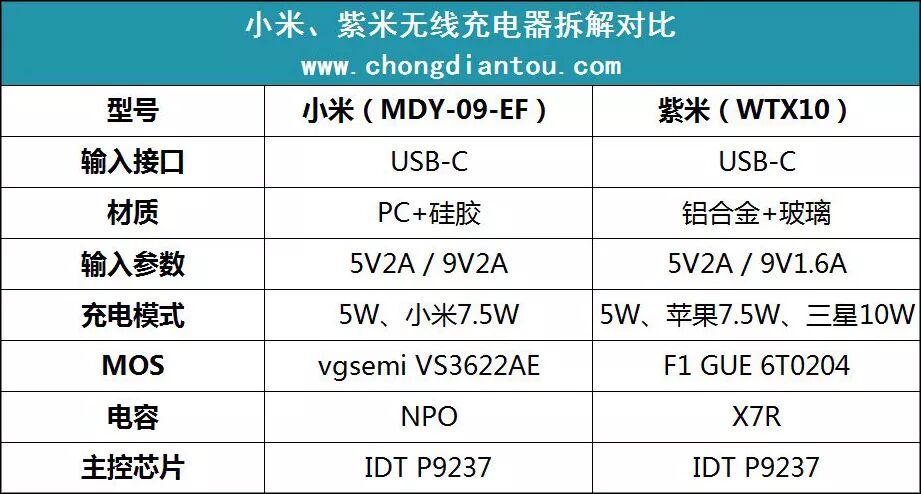 小米、紫米无线充电器二者无线充电方案均来自美国IDT,所采用的芯片型号也完全一样(IDT P9237),不知是巧合还是事先商量好的。不过除此之外,两者里里外外都各不相同,包括外部材质以及内部结构及零部件,好在设计及做工都可圈可点。小米售价99元,紫米售价129元(附带适配器+数据线),性价比都很高,均支持无线快充,只是各自官方页面宣称支持的无线充电模式有所不同。