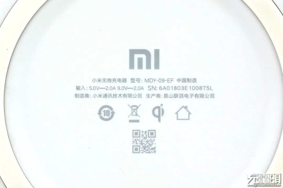 包装盒背面产品信息如下,品名:小米无线充电器、适用机型:Mi MIX 2S及通过(Qi)认证的产品、产品材质:PC+硅胶、制造商:小米通讯技术有限公司、生产商:昆山联滔电子有限公司、型号:MDY-09-EF、输入:5V2A / 9V2A。