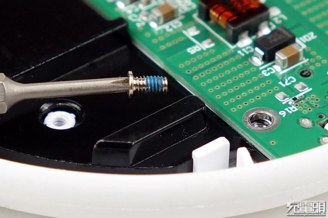 小米无线充电器采用上下壳螺丝拧紧的方式合盖,先把橡胶防滑垫撬出可以看到螺丝位。