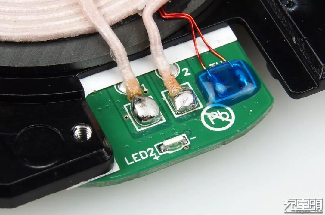 线圈焊接点饱满浸润度高,扁平侧射贴片式的LED,温度探头焊盘滴胶固定处理避免震动脱焊。