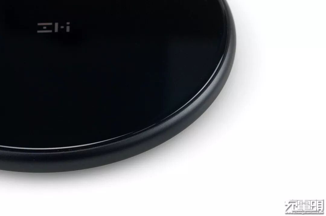 紫米无线充电器主体是全黑基调,面板使用了黑色lens 2.5D玻璃制作而成,硬度高可以抗划痕,面板中间是紫米“ZMI”LOGO。