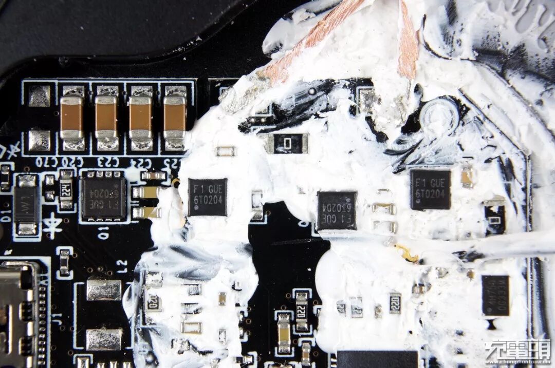 把线圈盘去掉后可以看到PCB本体,一大堆导热硅橡胶固定着。