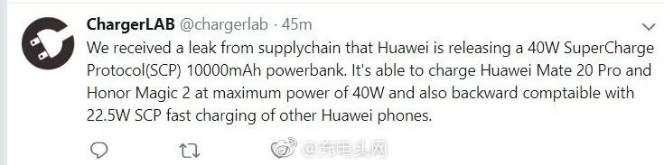 除此之外,这么大功率主要为Mate 20 Pro以及荣耀Magic 2量身打造,目前华为这两个机型均支持40W超级快充。
