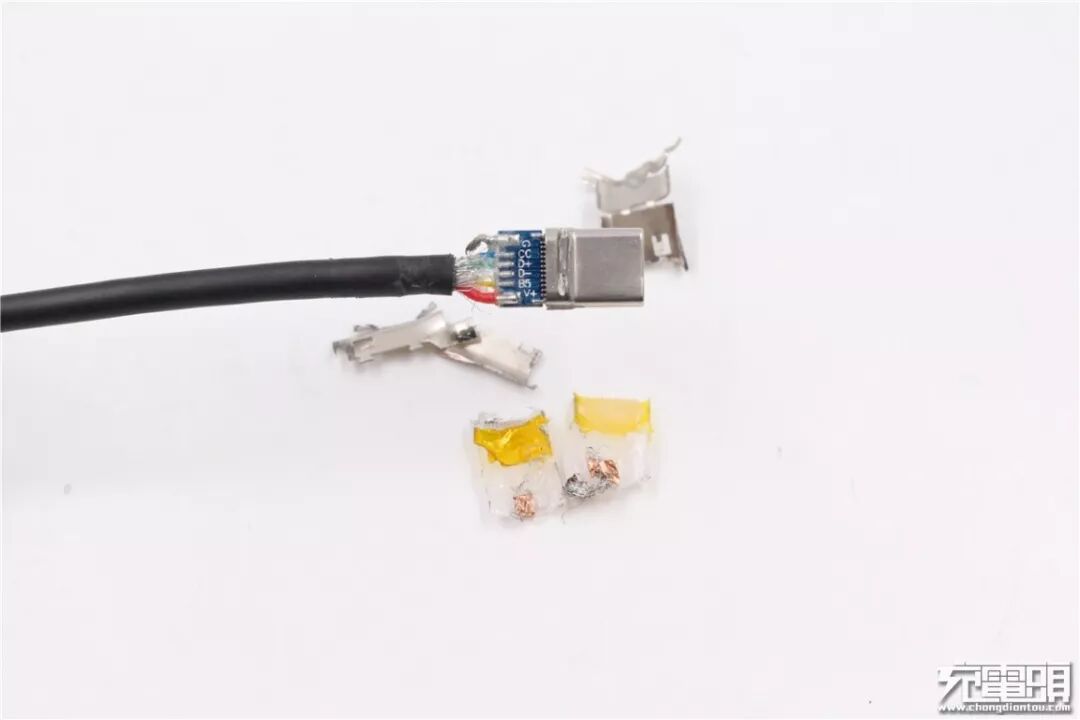二、thinkplus电源线拆解首先使用切割机将线材其中一个USB-C接口的塑料硬胶外壳切开,剥掉外壳及内部注塑的软胶。