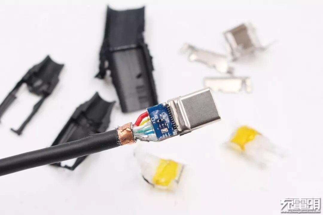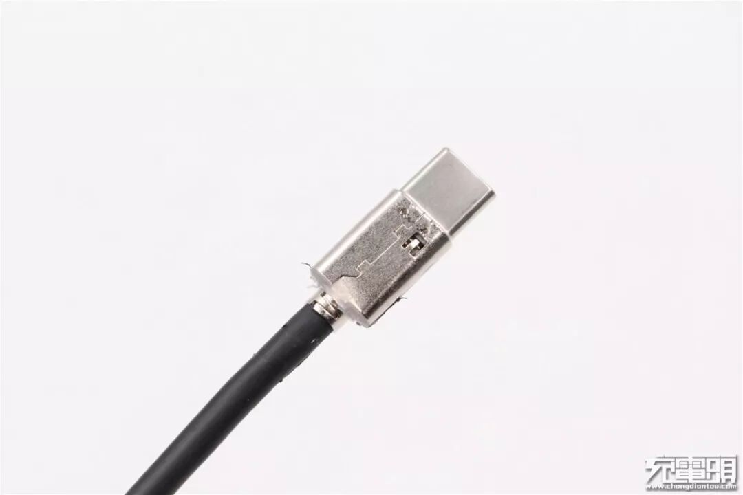 USB-C接口的正面金属套壳有一条扣合缝隙,金属套壳尾部有一个金属箍的结构与线材连接,另一端靠近USB-C连接器的位置有一排焊点,这是点焊机作业留下的痕迹,保证金属套壳与USB-C连接器可靠连接。