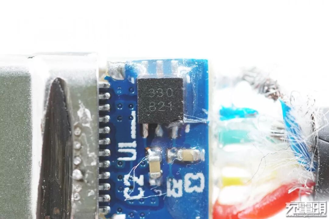 细看之下,发现这颗芯片上有“330 821”的丝印字样,经过充电头网查询得知,这颗芯片来自Hynetek慧能泰,型号为:HUSB330。据了解,HUSB330已经取得USB-IF认证,TID号1000060,XID号0005396。