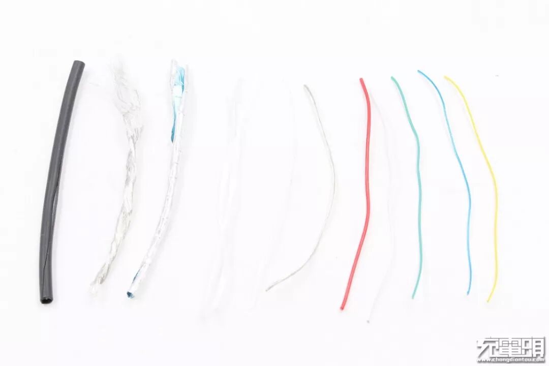 线材部分一览,从左至右分别是最外层塑料外被、金属屏蔽网、锡纸屏蔽层、抗拉纤维、抗拉尼龙线、六根数据及电力线芯。