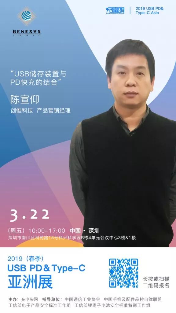 创惟科技产品营销经理 陈宣仰,本次峰会的演讲主题是《USB储存装置与PD快充的结合》。陈宣仰先生,自2011年起担任台湾创惟科技股份有限公司的产品营销经理,负责市场调查、产品规划与营销以及客户支持,拥有USB、PCIE与高速储存接口等相关领域11年的从业经验。