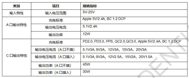 参考设计的规格指标如上表。除此之外,可以按照客户的需求设置成总功率30W,60W,65W或其他功率等级的A+C双口输出智能功率分配方案。