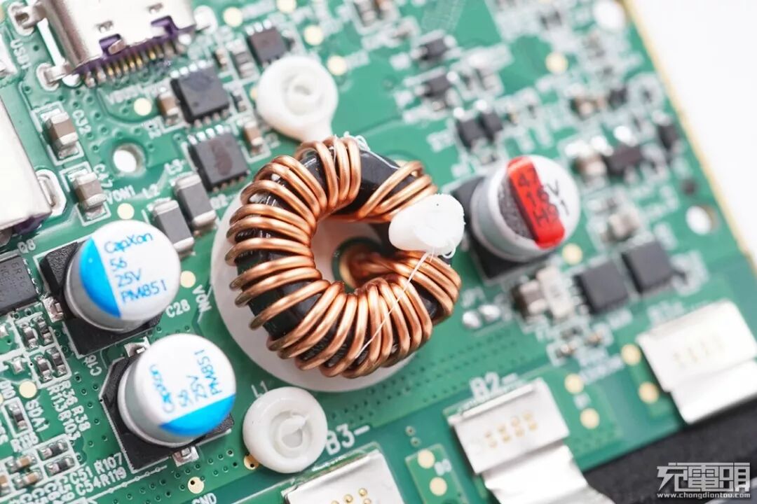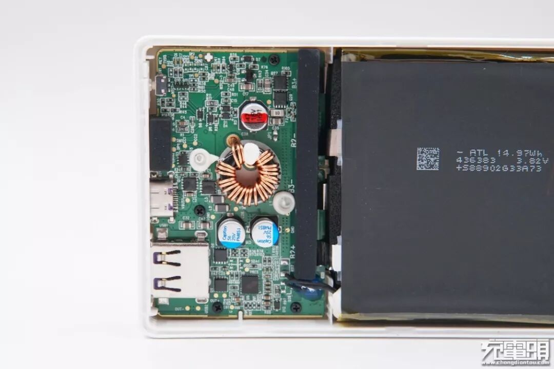 充电头网拆解发现,这款产品内部采用3块ATL电芯串联设计,电池端电压相对比较高,电路板上的电流小一些,效率有保障,发热量也可以得到有效控制。同时采用RICHTEK立锜科技全集成升降压控制器,集成PD和快充协议,外围只需要搭配开关管和电感元件即可组成完整的PD移动电源。此外,移动电源内置TI 电池保护芯片和温度检测,为电池提供更好的保护;接口与功率元件附近均布置了温度传感器,针对大电流下发热进行监控,对移动电源提供保护。