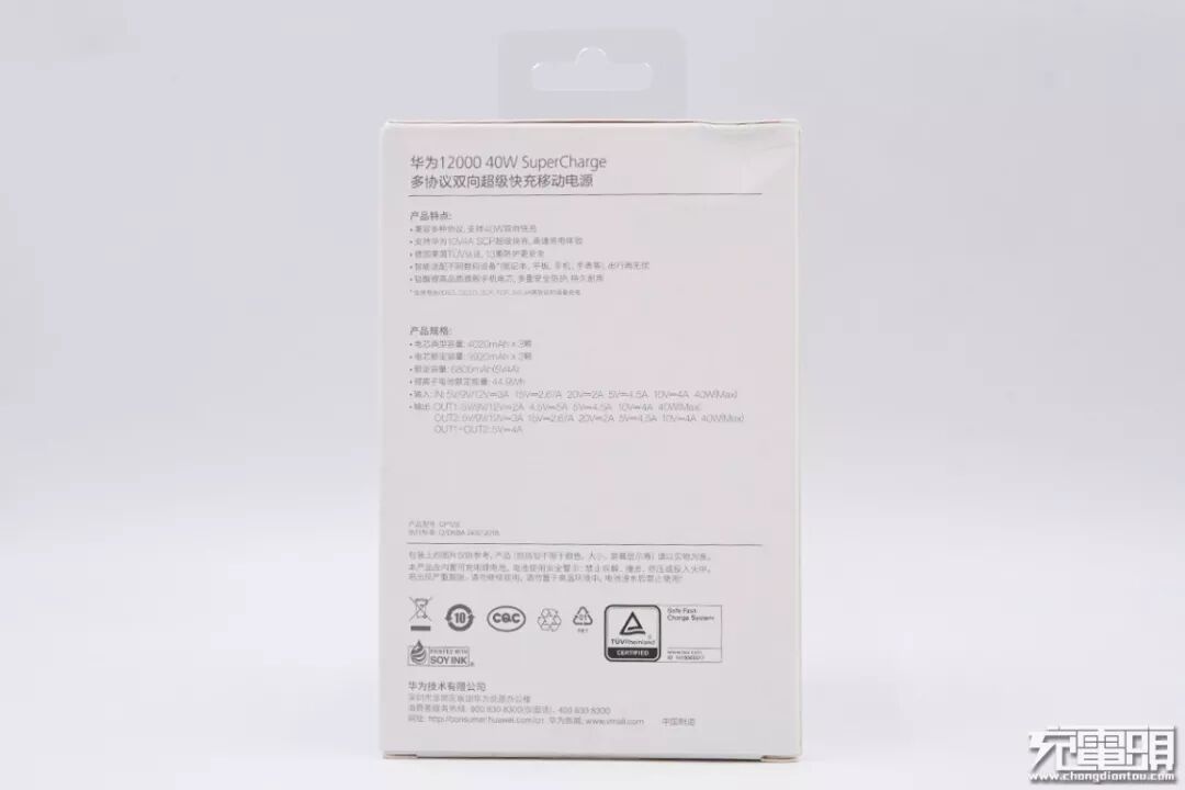华为40W SCP移动电源包装盒背面有着更多的产品特点及产品规格。产品特点:兼容多种协议,支持包括PD 3.0、QC 3.0、SCP、FCP、5V/2.4A等协议的设备充电,支持40W双向快充;德国莱茵TüV认证以及13重防护更安全,内置钴酸锂高品质旗舰手机电芯,多重安全防护,持久耐用。