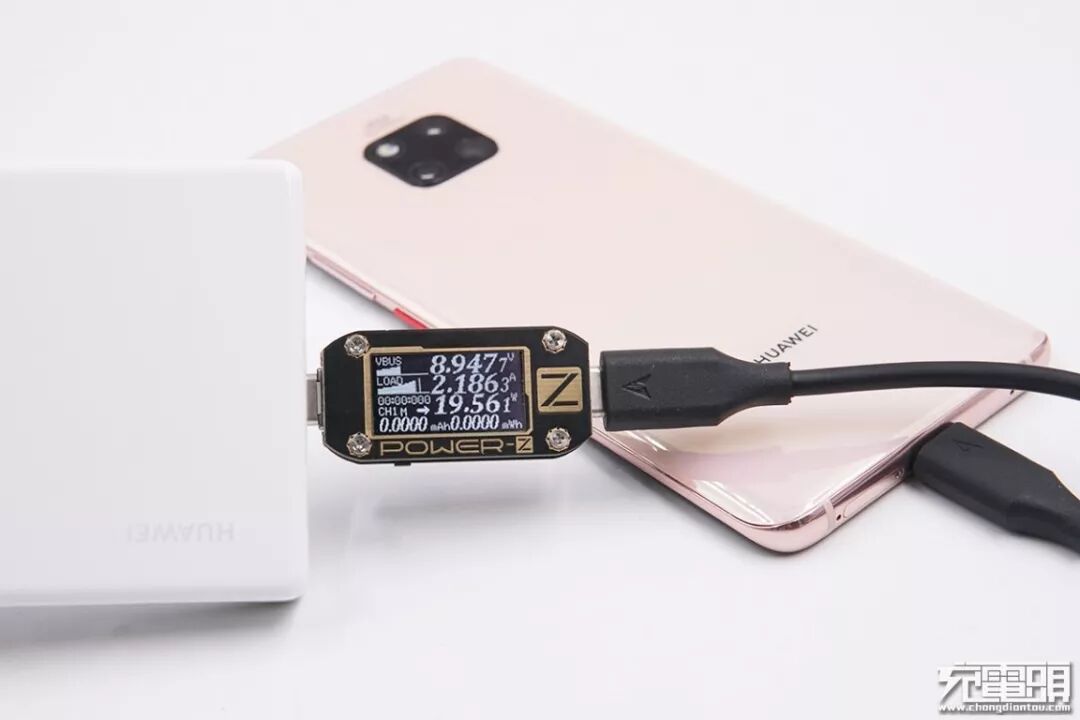 使用POWER-Z KM001C测试USB-C给华为Mate 20 Pro(UD)充电,电压8.94V,电流2.18A,功率19.56W,开启快充。
