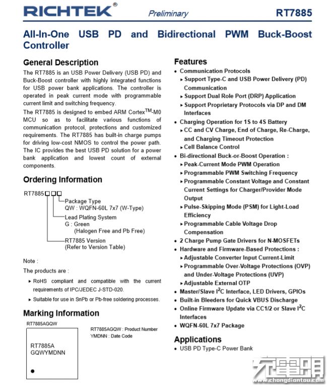 RICHTEK立锜科技RT7885的升降压控制器,同时集成PD协议识别和MCU,可减少外置元件数量,内置电荷泵,可驱动低成本的NMOS,支持1到4串锂电池充电,非常适合移动电源使用。